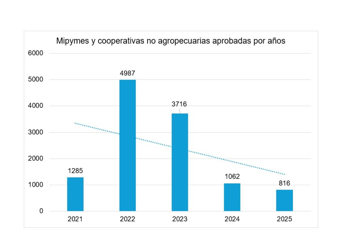 Las aprobaciones de mipymes y cooperativas se han ralentizado notablemente, como muestra el gráfico más abajo. Respectivamente, en 2024 y 2025 solo se alcanzó el 29 y 22 % de las aprobaciones de 2023, el último año con un registro alto. Hay dos razones fundamentales detrás de esta tendencia: