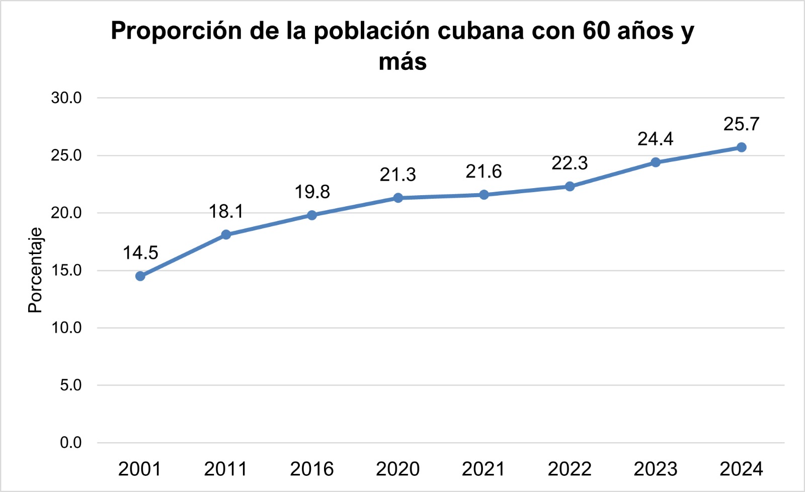 ¿Qué tan relevante es ese indicador? Como referencia, la medición del envejecimiento poblacional en el resto del mundo se calcula desde los 65 años. Según Our World in Data, una prestigiosa base de datos, Cuba comparte el podio mundial de los países más envejecidos junto a Japón (29,5 %), Italia (24,2 %), Puerto Rico (24,2 %), Portugal (24,1 %), Finlandia (23,6 %) y Grecia (23,5 %).