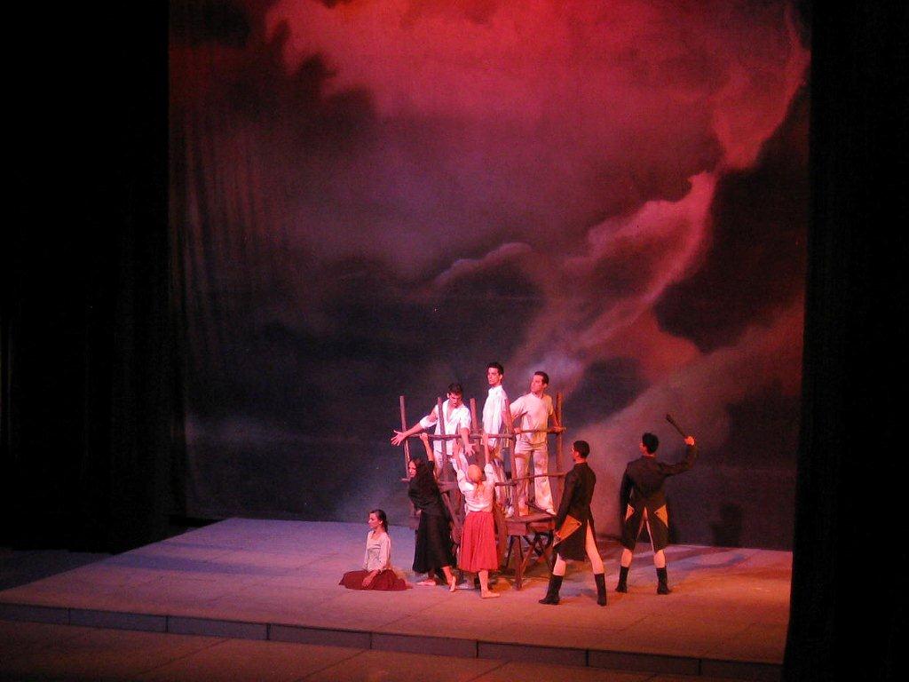 Escena del ballet “La carreta”, de Alicia Alonso. Al fondo, telón de Gólgota.