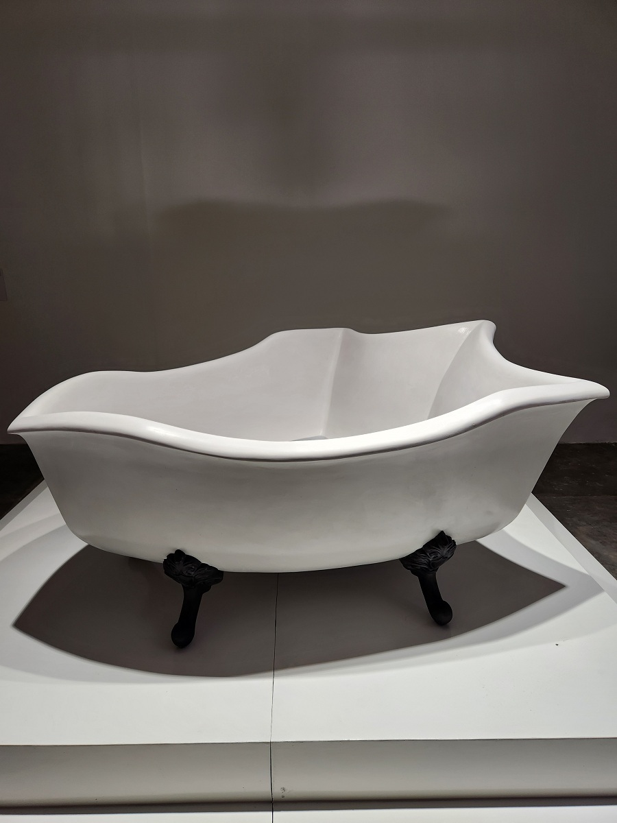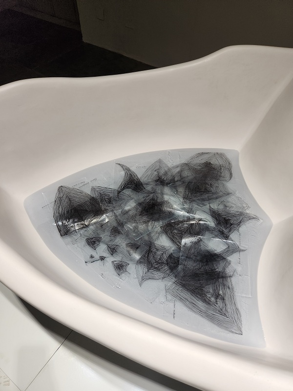 Pasamos a “Ablución”. El escudo ahora es una tina o bañera. Más que proteger, contiene; más que simbolizar protección, pasa a ser continente de un rito de purificación, una apropiación íntima. Dentro, lo que sugiere agua empozada, probablemente sean lastres que se han ido liberando según la experiencia de vida de la artista.