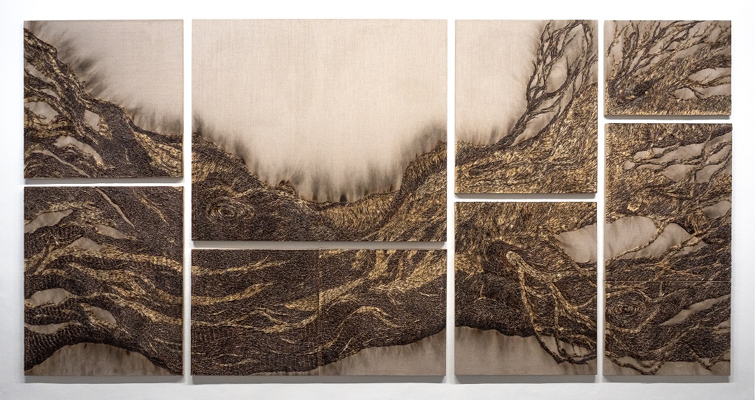 “Leña del árbol caído”, 2026. Fósforos pegados y quemados sobre lino. Conjunto: 220 x 430 cm.
