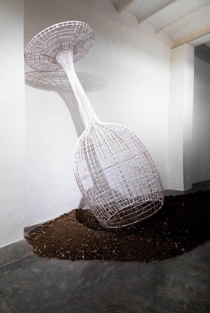 “Demarcación del territorio” es una obra de 2023. Una inmensa copa invertida intenta atrapar la materia (tierra) que se escurre de sus bordes. Según la artista, su propósito es discursar sobre el poder y su perversa y fútil vocación de controlarlo (doblegarlo) todo. La copa, al volcarse, se ha vaciado, que es como decir que deja de ejercer lo que esencialmente la definía. Ha pasado de simbolizar el ambiguo binomio éxito-poder a testimoniar la derrota.