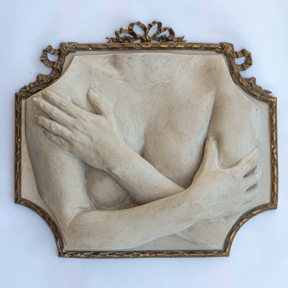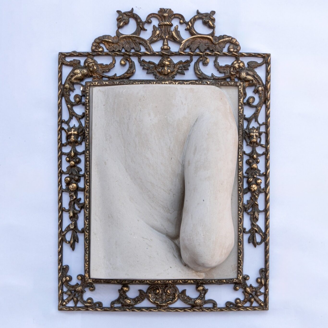 “Susurro”, 2025. De la serie “Cartografía de un cuerpo”. Molde al natural de la artista fundido en resina de poliéster y fibra de vidrio sobre marco antiguo de bronce, 50.8 x 35.56 x 10.16 cm.