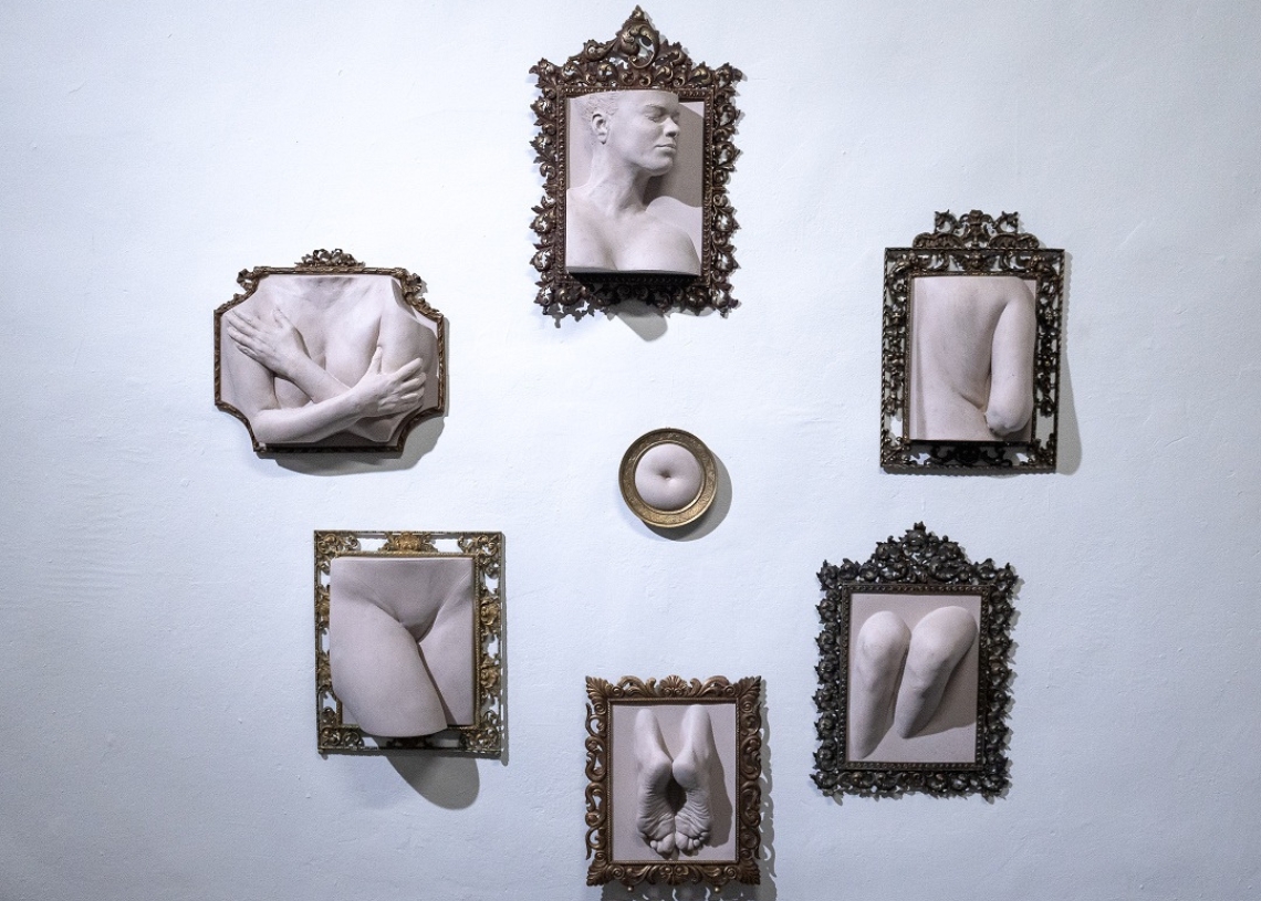 “Serie “Cartografía de un cuerpo”, 2025. Moldes al natural de la artista fundidos en resina de poliéster y fibra de vidrio sobre marco antiguo de bronce.