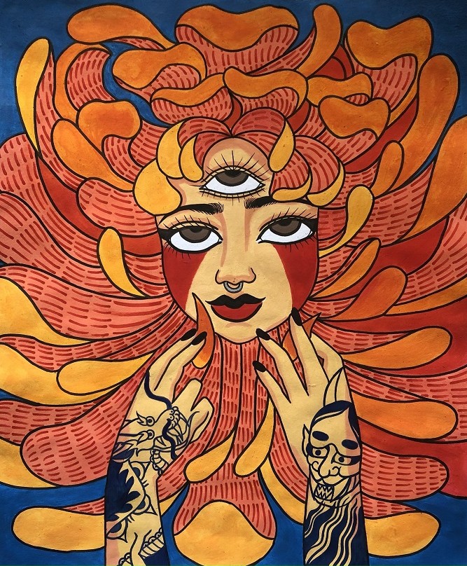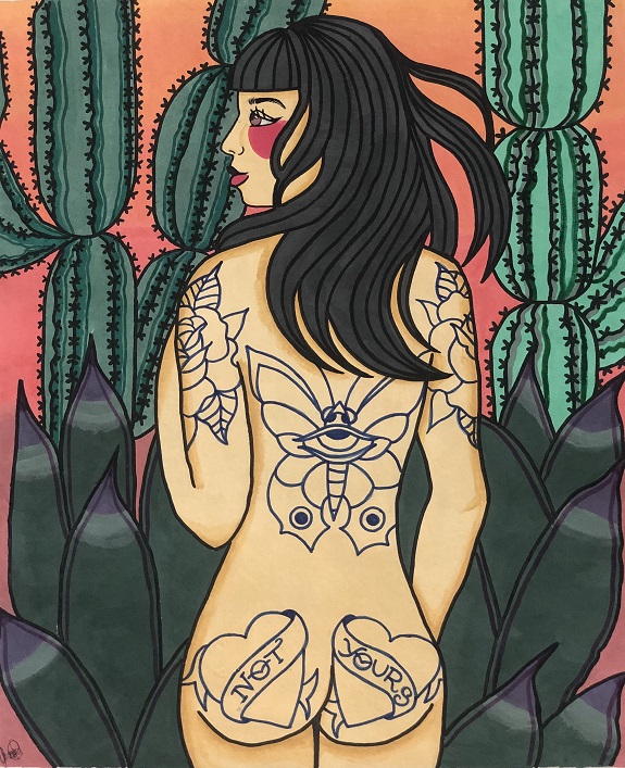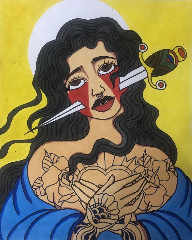“Su trabajo como ilustradora ofrece su visión particular del universo femenino. Toma las formas del tatuaje tradicional americano y las plaga de diversos simbolismos para entregar un mensaje que el espectador debe descifrar. La naturaleza, la mujer y la representación de lo divino, lo folklórico y lo erótico son elementos de obligatoria aparición en su obra.”