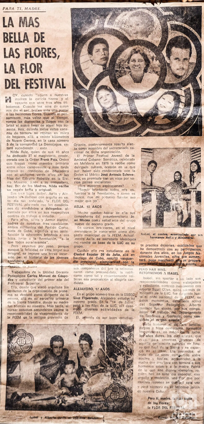 Esta foto marca el comienzo de la aventura en la Isla de toda mi familia. A mi madre se la había llevado su abuela Isolina para La Habana. La sacó de la Sierra con 10 años, donde el fango le llegaba hasta las rodillas, y le enseñó modales de “jovencita”. Mi mamá, desde La Habana, se convirtió en miembro del secretariado nacional de la FEEM y mi tía la China pertenecía al secretariado de Oriente. Ambas se encontraron en un Congreso Nacional de la FEEM en la Isla de La Juventud.